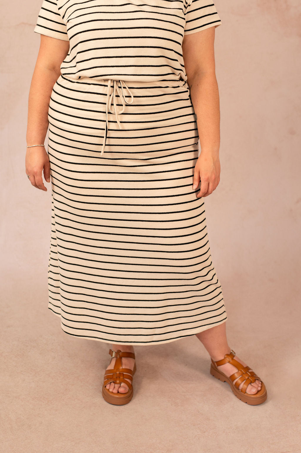 Avec son allure estivale et sa coupe fluide, la Jupe Jana est un indispensable facile à porter. Ce modèle jupe longue droite motif marinière associe confort et style grâce à sa taille élastiquée avec lien ajustable et son motif rayé beige et noir. Légère et agréable au toucher, elle s'adapte à toutes les morphologies et s’inscrit parfaitement dans une sélection de vêtements pensés pour le mid size et le plus size.