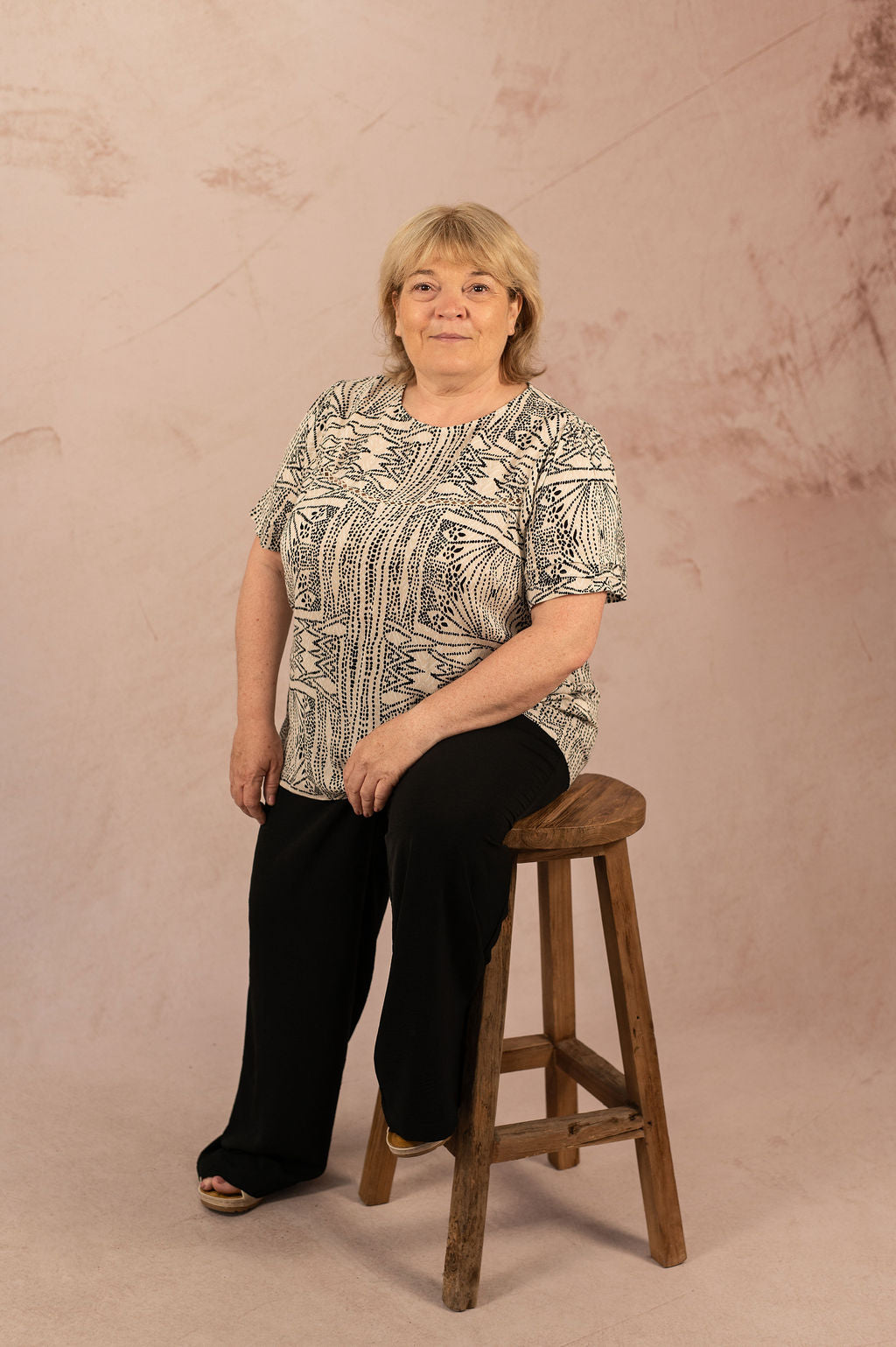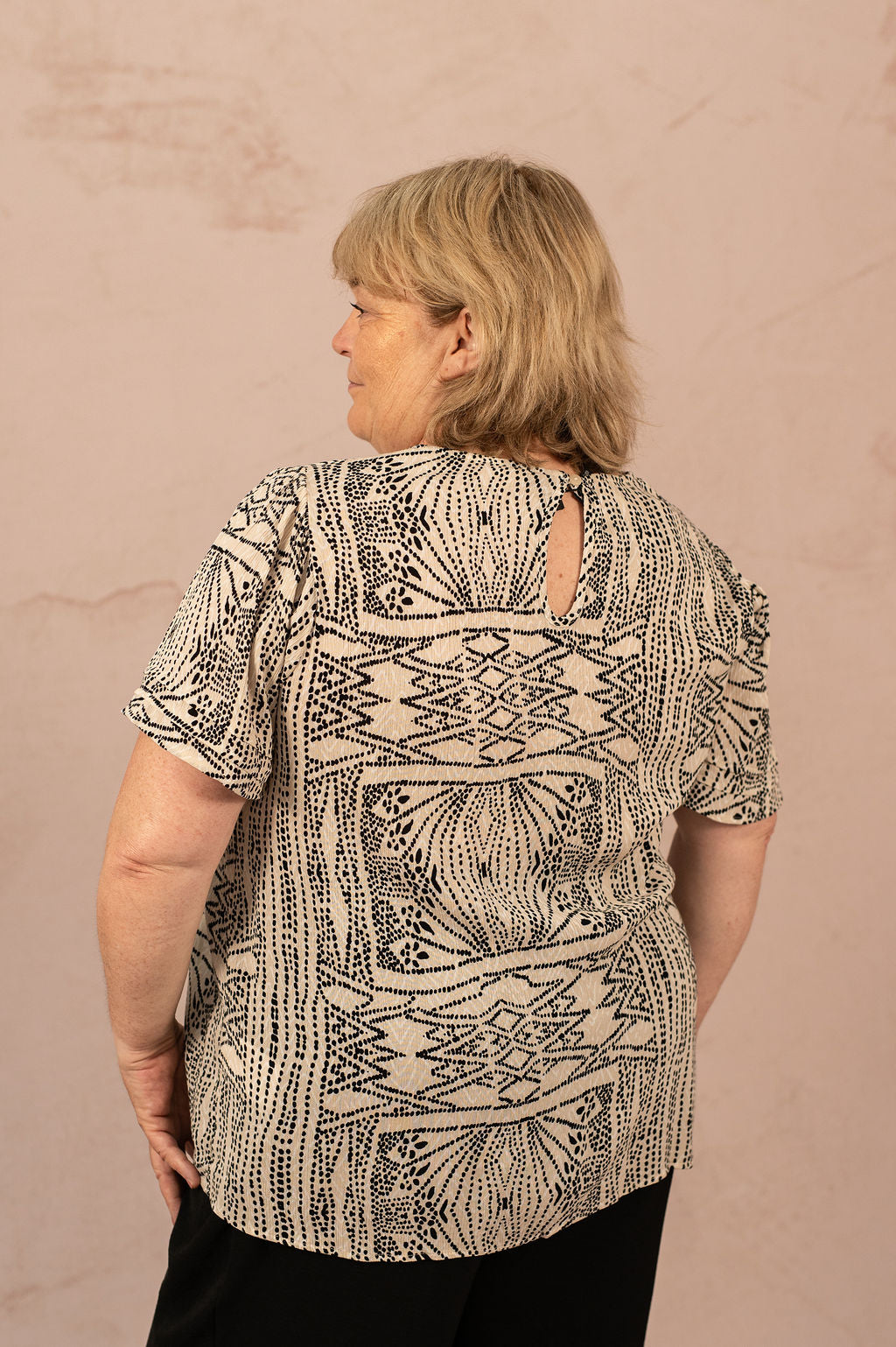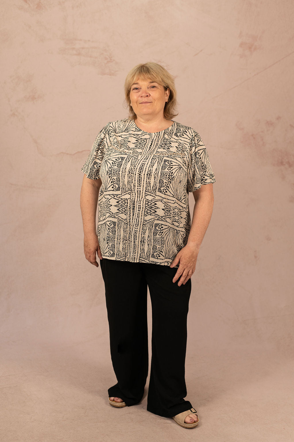 Le T-shirt fluide à imprimé Menny est une pièce idéale pour apporter une touche d’originalité à votre dressing tout en restant confortable. Son tissu léger et sa coupe droite en font un allié parfait pour toutes les morphologies du 40 au 54. L’imprimé graphique noir sur fond écru donne du caractère à votre tenue sans en faire trop.