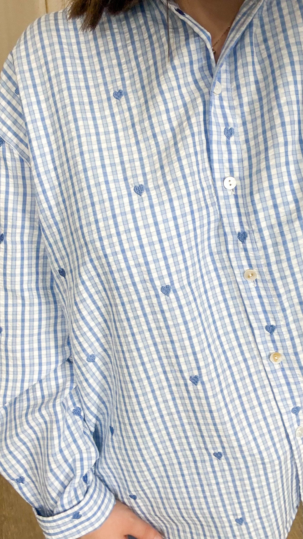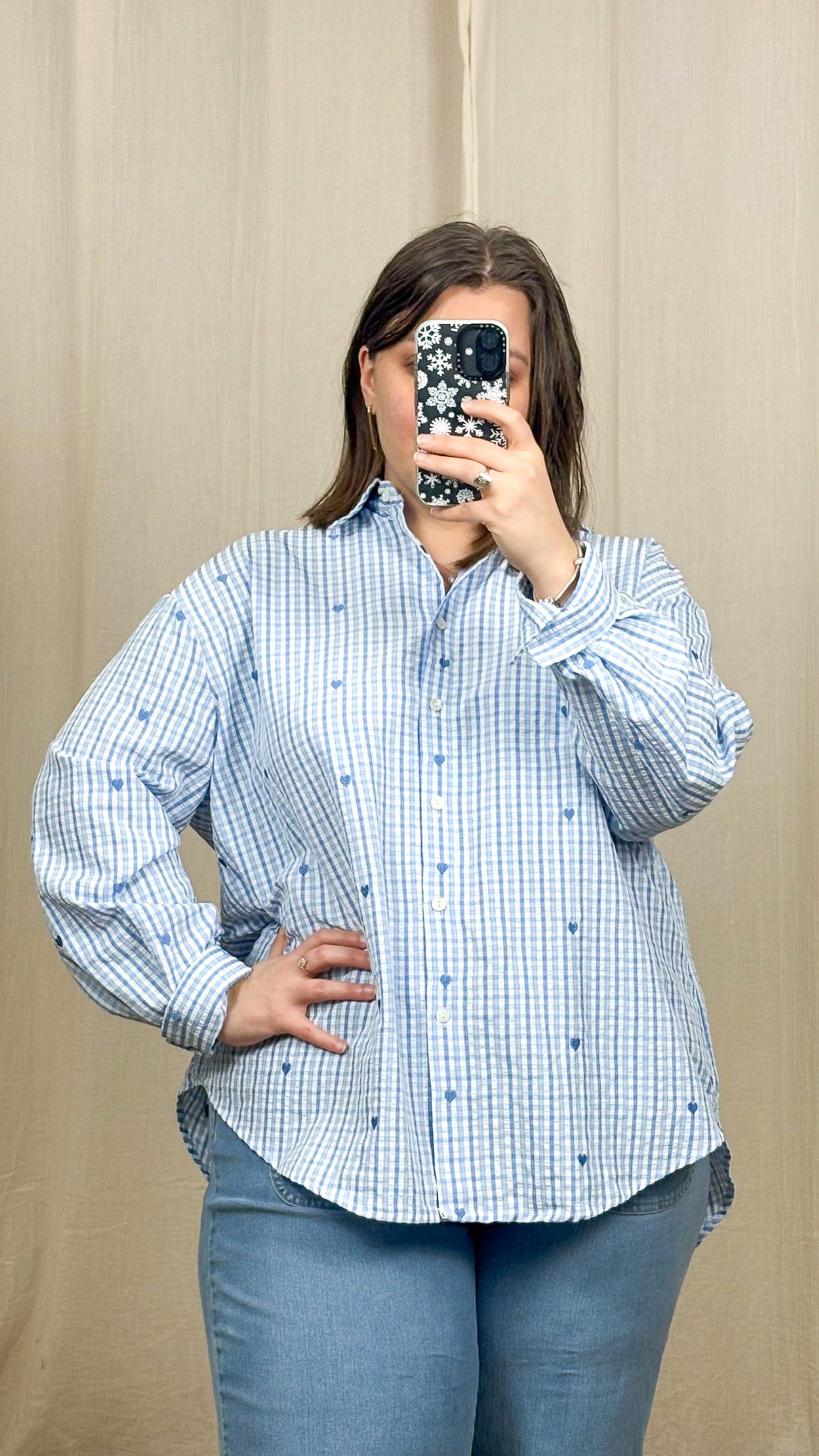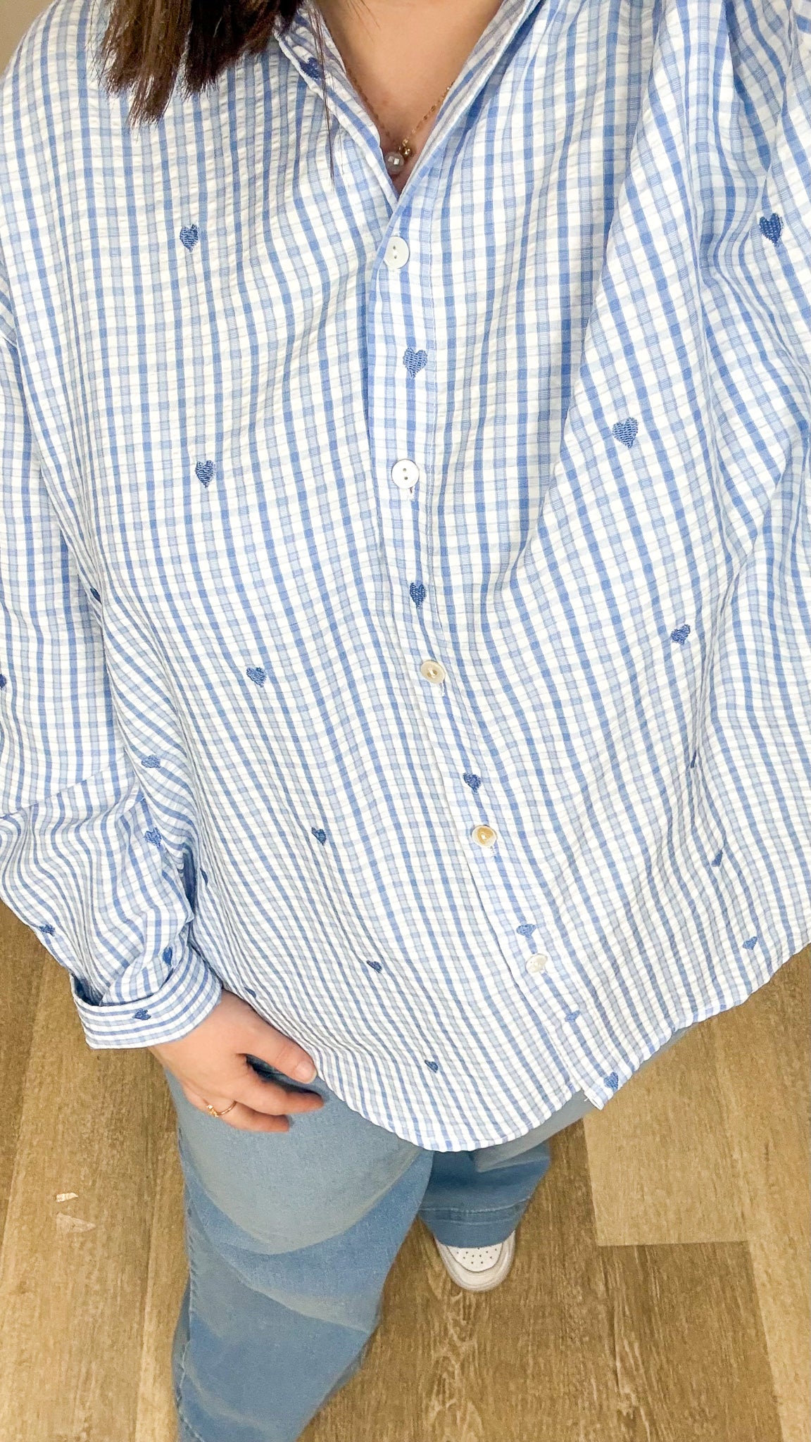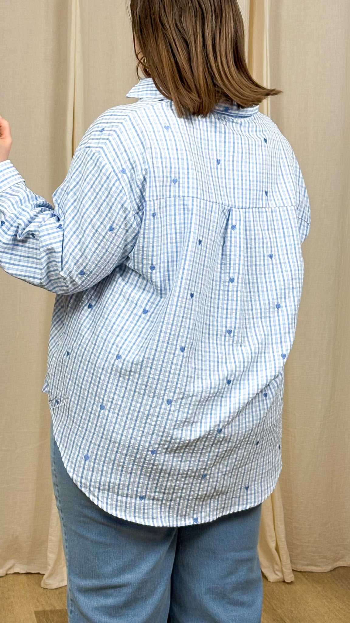La Chemise Ingrid revisite l’intemporel vichy avec une touche de douceur et de féminité. Son imprimé vichy bleu est délicatement ponctué de petits cœurs brodés, pour un rendu à la fois chic, romantique et facile à porter. Une pièce parfaite pour enrichir un vestiaire de vêtement grande taille, pensée pour mettre en valeur les silhouettes sans contrainte.