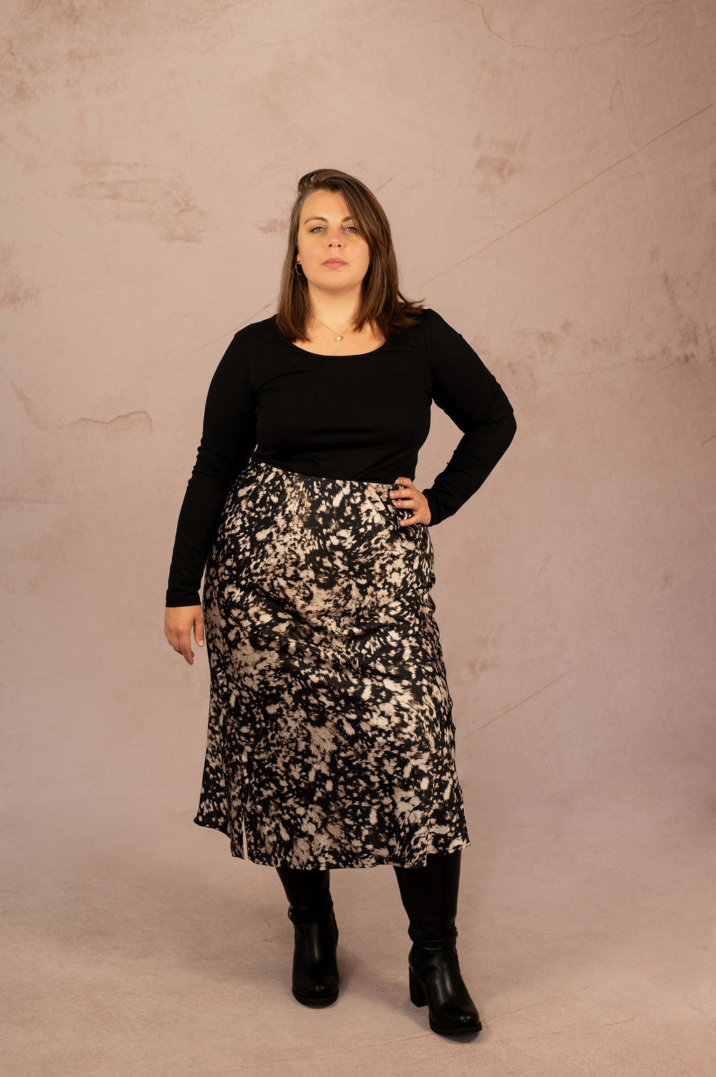 Associez la Jupe Domina à un pull en maille uni pour casser le côté satiné ou jouez la carte du chic avec un top noir ajusté. Idéale pour les silhouettes du 40 au 54, elle sublime les courbes avec douceur et modernité.