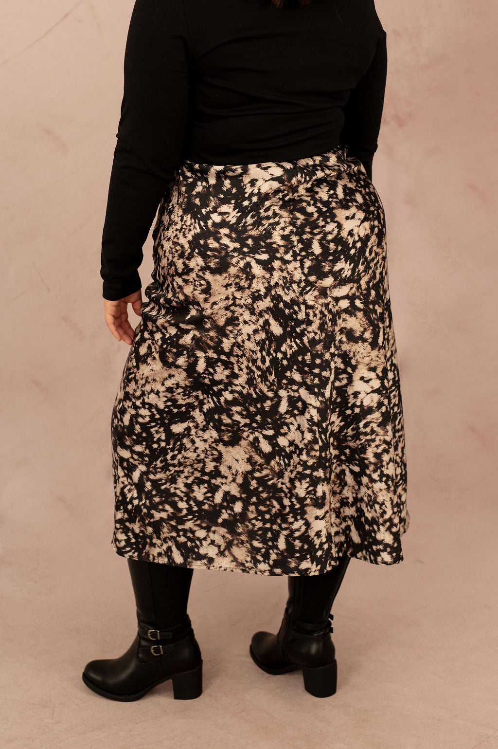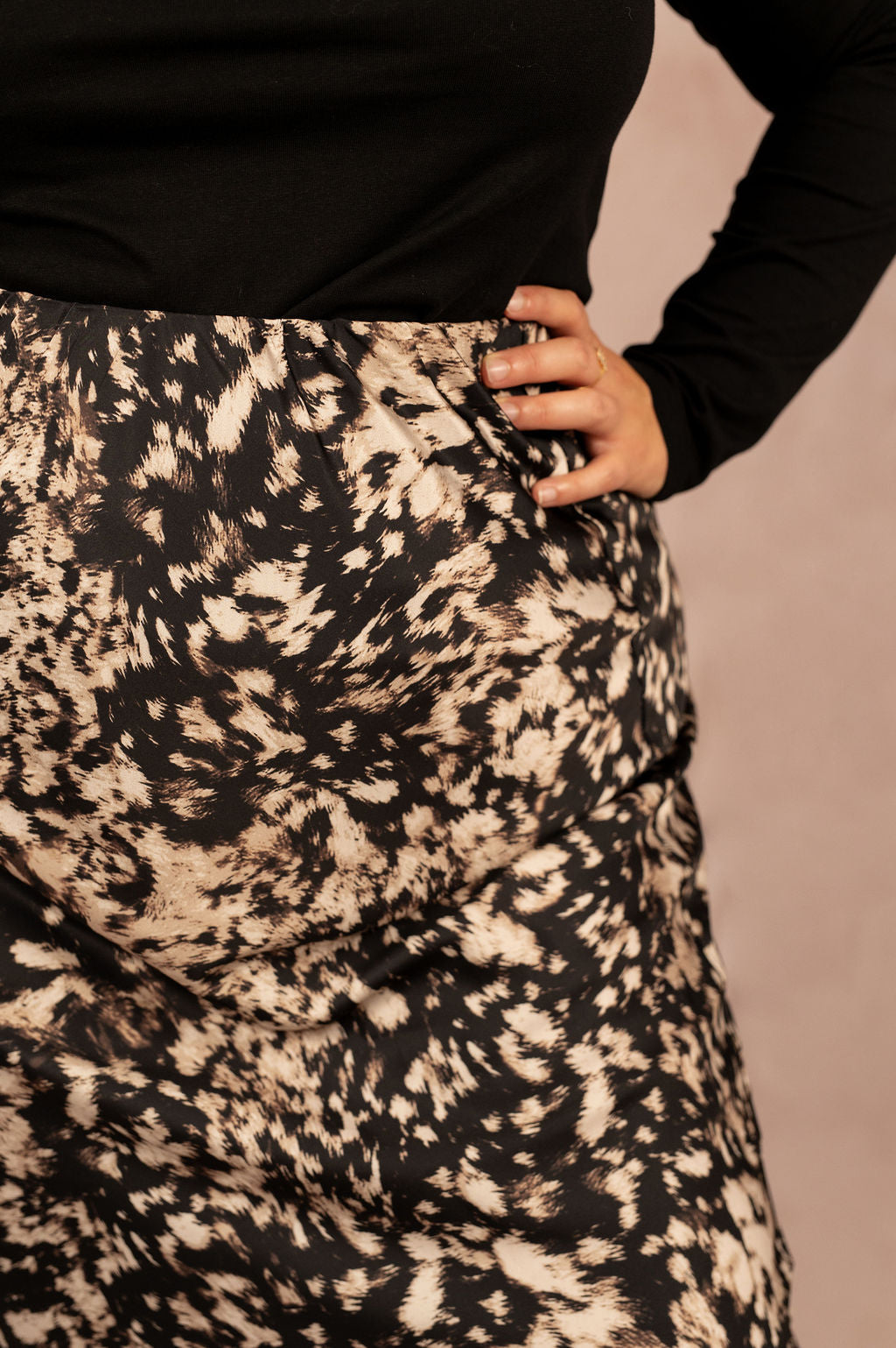 La jupe Domina séduit par son imprimé abstrait noir et beige et son tissu satiné fluide, qui apporte une touche de brillance subtile à vos tenues. Sa coupe midi légèrement évasée suit le mouvement du corps pour une silhouette élégante et moderne, quelle que soit votre morphologie.