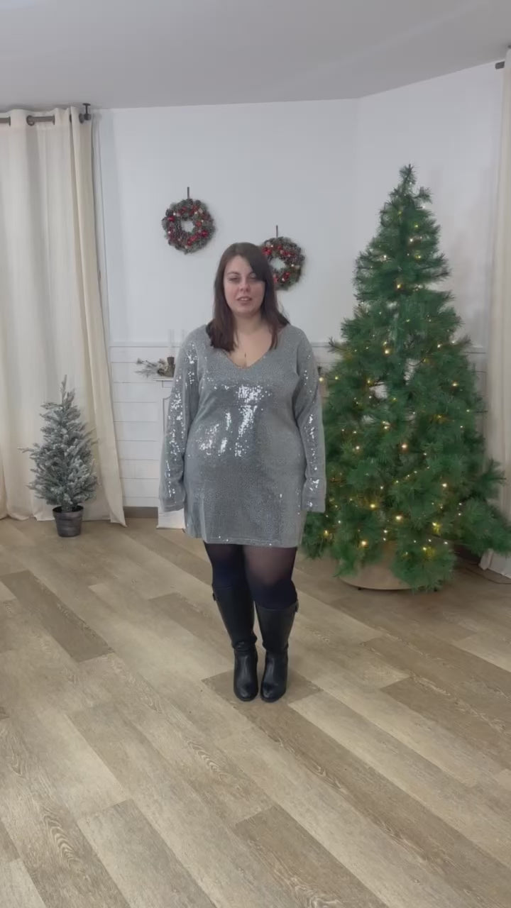 La Robe Colombe est la pièce festive par excellence : une robe courte, entièrement recouverte de sequins lumineux, parfaite pour briller en soirée. Sa coupe droite et son décolleté en V devant–dos mettent en valeur la silhouette tout en assurant un maximum d’éclat. Sa longueur courte en fait une alliée idéale pour les morphologies plus petites, tout en offrant un confort remarquable du 40 au 48. Une pièce pensée pour sublimer chaque déesse dans un esprit de vêtement grande taille inclusif et glamour.